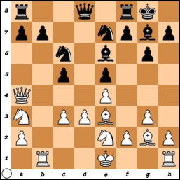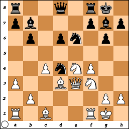 1.e4 c5 2.g3 Nc6 3.Bg2 g6 4.c3 Bg7 5.Ne2 e5 6.d3 Nge7 7.Be3 Qb6 8.Na3 d6 9.b4 Be6 10.Qa4 O-O 11.bxc5 dxc5 12.Rb1 Qd8