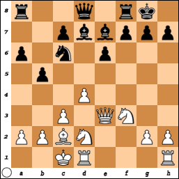 1.d4 e6 2.e4 d5 3.Be3 dxe4 4.Nd2 Nf6 5.f3 Nc6 6.Bb5 Bd7 7.c3 a6 8.Ba4 Nd5 9.Qe2 exf3 10.Ngxf3 Be7 11.Bc2 Nxe3 12.Qxe3 O-O 13.O-O-O b5